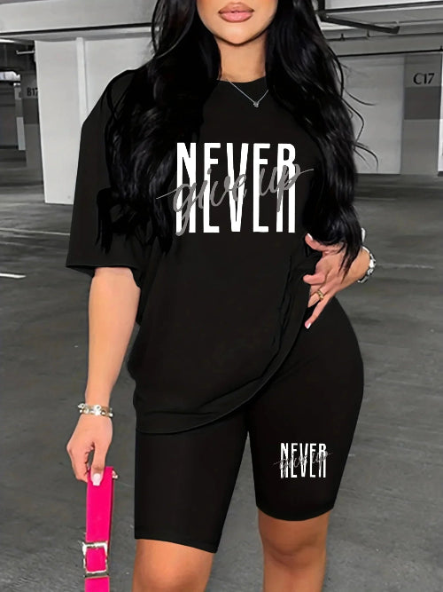 Women's fashion casual sports "NEVER Give Up" printed on T-shirt+shorts two-piece set