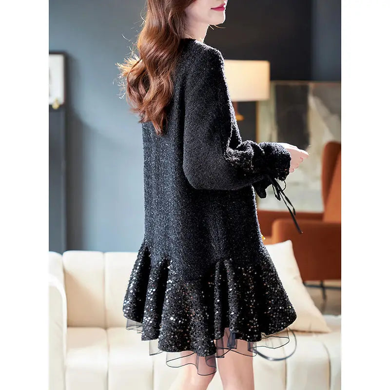 Black Mesh Sequin Dress – Slim Silk Midi Skirt for Women