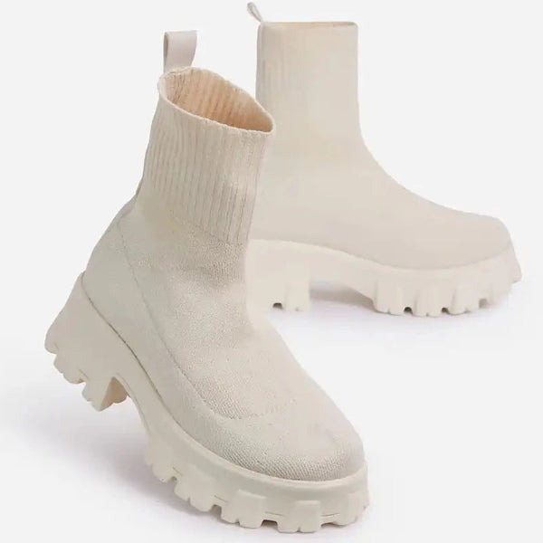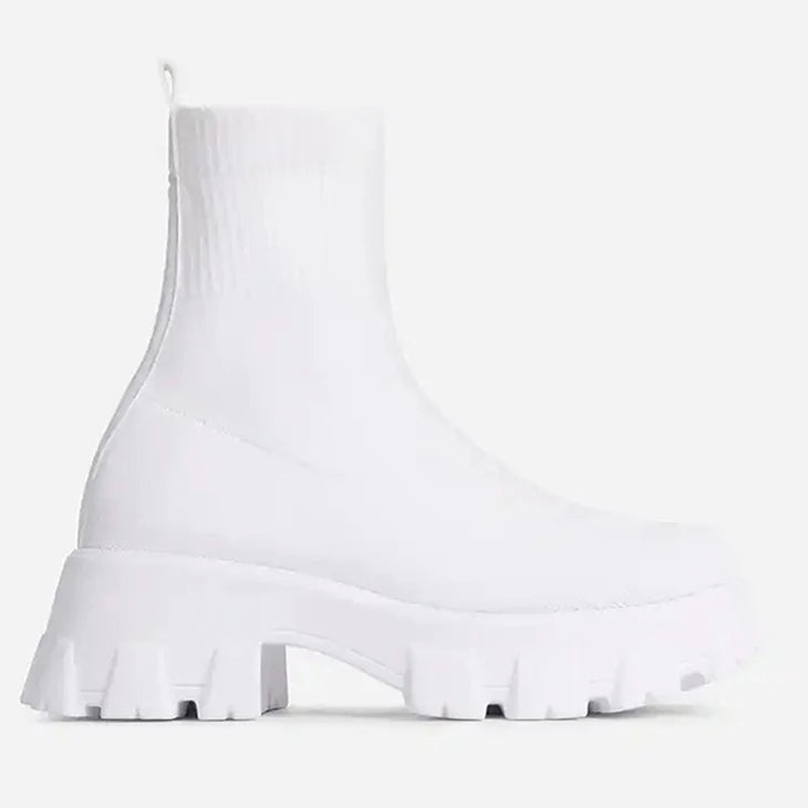 Elevate your seasonal wardrobe with these chic Women’s White Platform Boots, perfect for autumn and winter. Featuring a trendy sock-style ankle fit and sturdy platform heels, these boots combine comfort and fashion effortlessly.