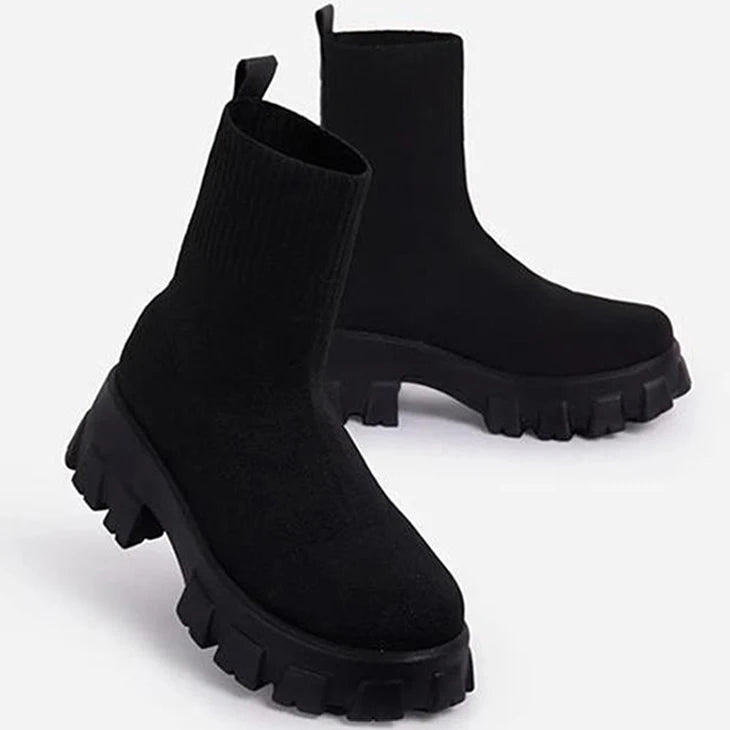 Department Name: ADULT Brand Name: KUIDFAR Model Number: HHA016 Style: Concise Fashion Element: Platform Shaft Material: Stretch Fabric Fit: Fits true to size, take your normal size Platform Height: 3-5cm Heel Type: Square heel Toe Shape: round toe Season: Winter Upper Material: knitting Origin: Mainland China Insole Material: PU Item Type: BOOTS Pattern Type: Solid Outsole Material: RUBBER Lining Material: none Closure Type: SLIP-ON Boot Height: ANKLE Heel Height: Med (3cm-5cm) is_handmade: Yes Boot Type: Sock Boots CN: Guangdong With Platforms: Yes Choice: yes. Women Boots White Platform Boots For Winter Autumn Boots Feminine Socks Ankle Boots Platform Shoes Women Heels.